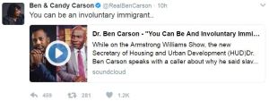As the 45th President’s Secretary of Housing and Urban Development, Ben Carson gave his first public address in which he said slaves were immigrants.