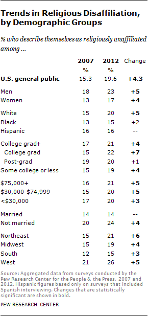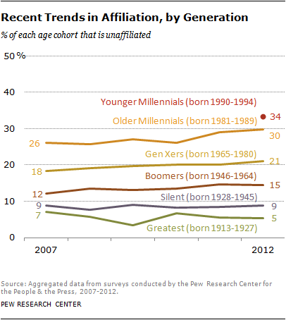 - declines cannot be blamed on children from families that are unaffiliated, to the contrary: “the new Pew Research Center/Religion & Ethics NewsWeekly survey finds that about three-quarters of unaffiliated adults were raised with some affiliation (74%).”