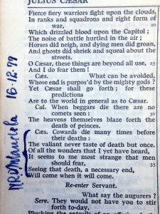Reportedly, thirty-two passages are marked as favorites in the book: Billy Nair marked Caliban’s lines in The Tempest which begin “This island’s mine”, and Walter Sisulu chose Shylock’s speech in The Merchant of Venice which includes ”for sufferance is the badge of all our tribe.” Nelson Mandela picked these lines from Julius Caesar: