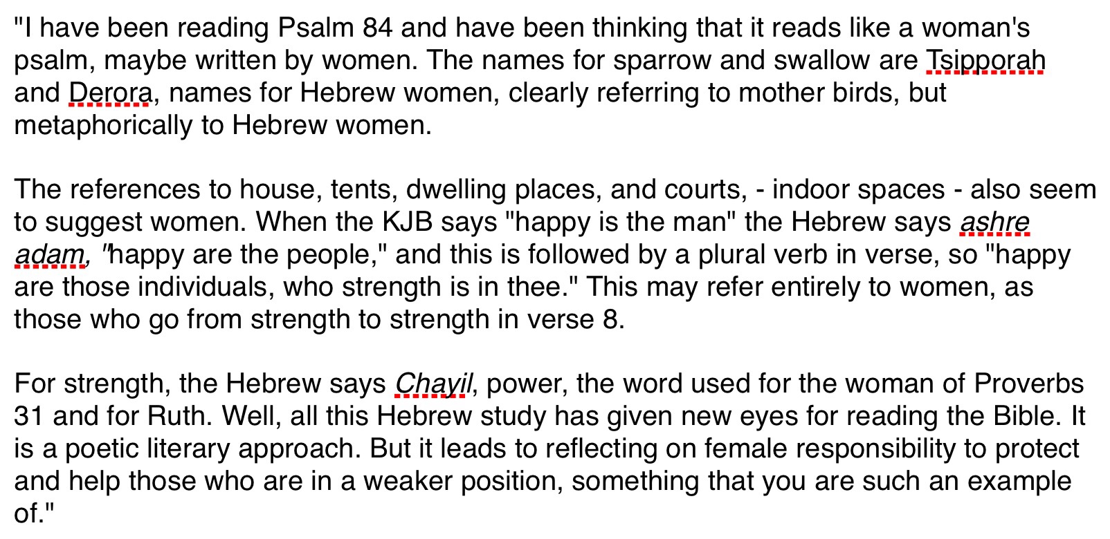 This is a reflection on Psalm 84 in Hebrew. It is copied from an email I sent to one of my sisters. I would love to know if anyone else has offered this interpretation of Psalm 84. It keeps me focused on women’s responsibility to their fellows, their peers, sisters or brothers, and not to their “fellows.”