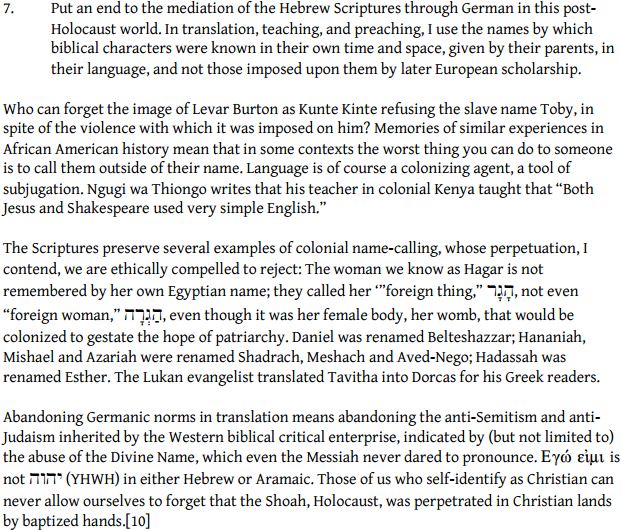 Here, then, is the Rev. Dr. Wil Gafney’s 7th of 7 Hebrew Bible translation principles (1 of One Black Feminist’s Translation Principles for all, or maybe most, of us):